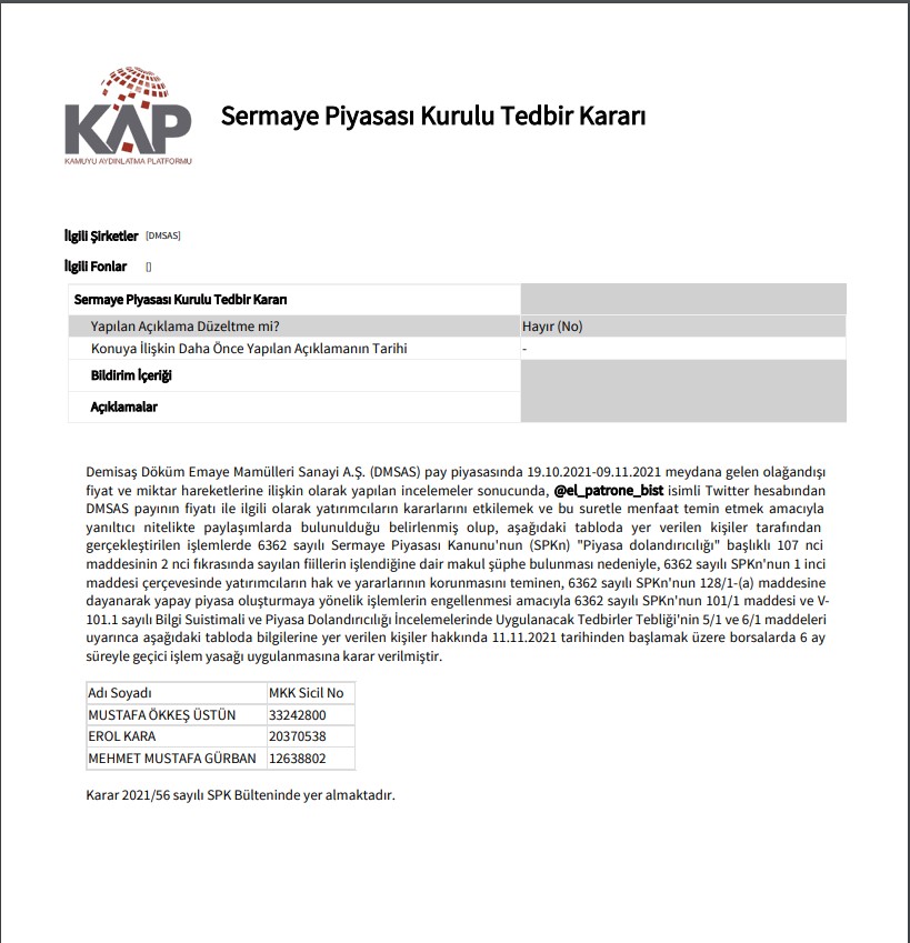 İYİ Parti Milletvekiki Gürban’ın da aralarında olduğu 3 kişi hakkında, Sermaye Piyasası Kurulu tarafından Demisaş Döküm Emaye Mamülleri Sanayi A.Ş. (DMSAS) hisse piyasasında 19 Ekim 2021 ile 09 Kasım 2021 tarihleri arasında meydana gelen olağandışı fiyat ve miktar hareketlerine ilişkin olarak yapılan incelemeler sonucunda bilgi bazlı piyasa dolandırıcılığı fiilin işlendiğine dair makul kuşku bulunması nedeniyle borsalarda 6 ay mühletle süreksiz işlem yasağı uygulanmasına karar verildiği ortaya çıktı.