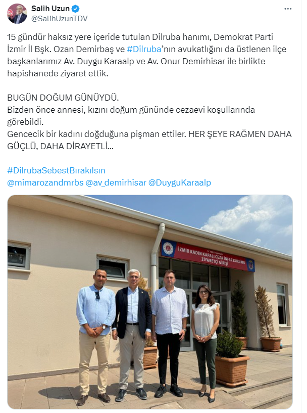 Demokrat Parti (DP) İzmir Milletvekili Salih Uzun, kentteki bir sokak röportajında kullandığı hükümete yönelik sözleri nedeniyle 15 gündür cezaevinde tutuklu yargılanan ve bugün doğum günü olan Dilruba Kayserilioğlu’nu Demokrat Parti İzmir Kent Başkanı Ozan Demirbaş, avukat Duygu Karlp ve avukat Onur Demirhisar ile İzmir Bayan Kapalı Cezaevi’nde ziyaret etti. Salih Uzun, ziyaretin akabinde şu açıklamayı yaptı: