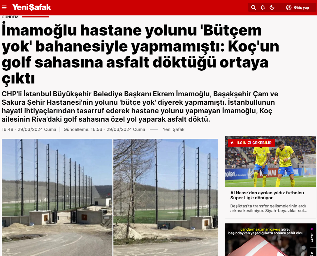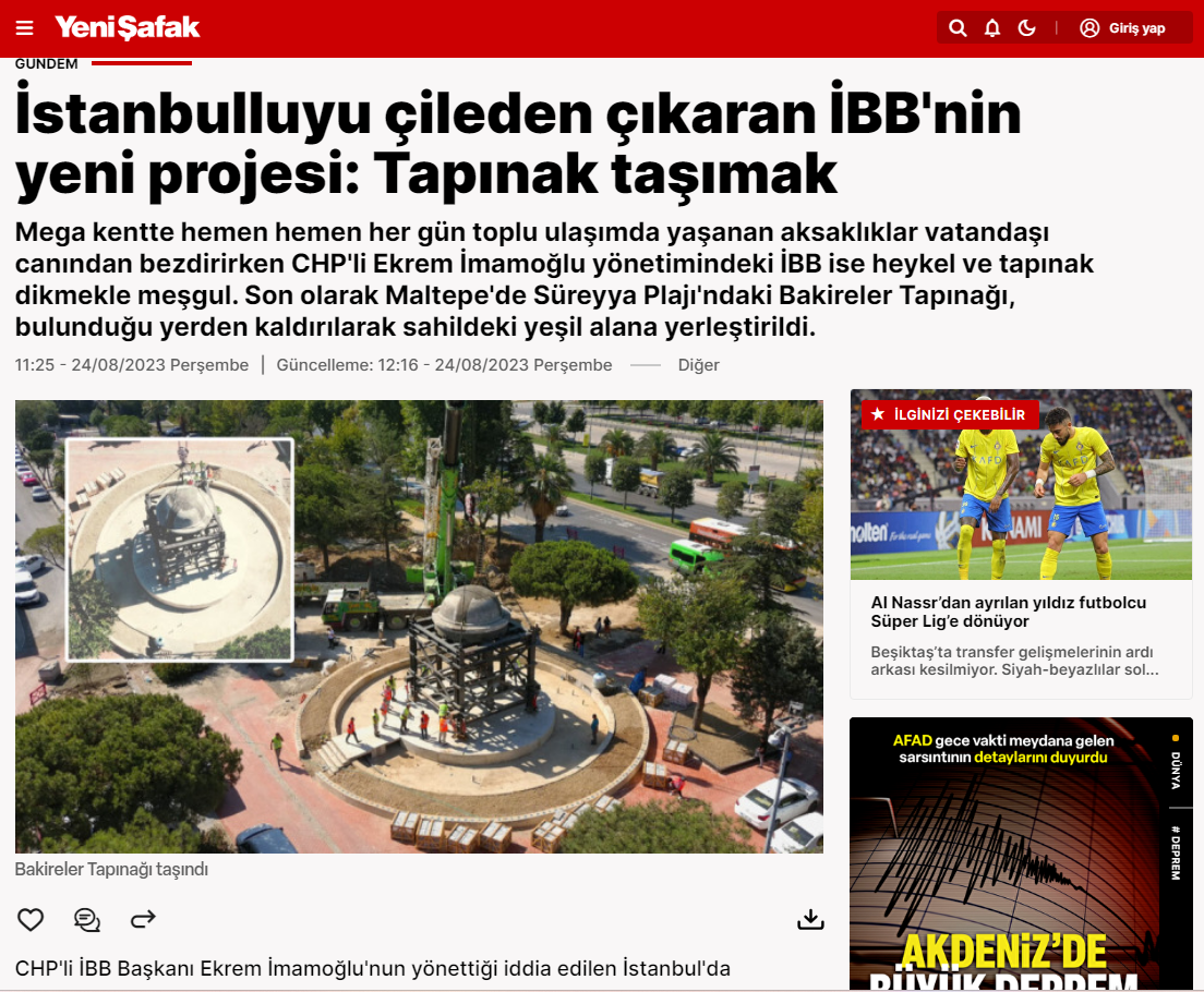 İstanbul Büyükşehir Belediye (İBB) Başkanı Ekrem İmamoğlu, Yeni Şafak gazetesinin kendisi hakkında yayımladığı haberlerle ilgili, “Her gün manşet atıyor gazetenin biri. Her gün manşet atıyor. Topkapı’da genel müdürlüğü var. Yeşil alanın üstüne bina (genel müdürlük) yapmışsın. Bir de devlet bir yapı dokümanı uydurması çıkarmış. Yapmışsın, hak iddia etmişsin. Bana kalkmışsın yeşili anlatıyorsun” dedi.
