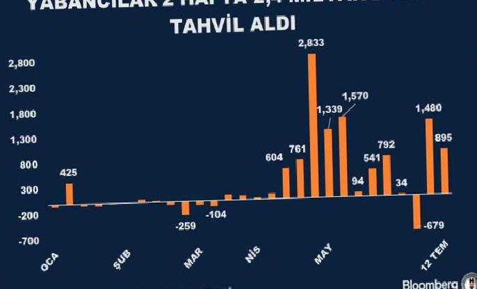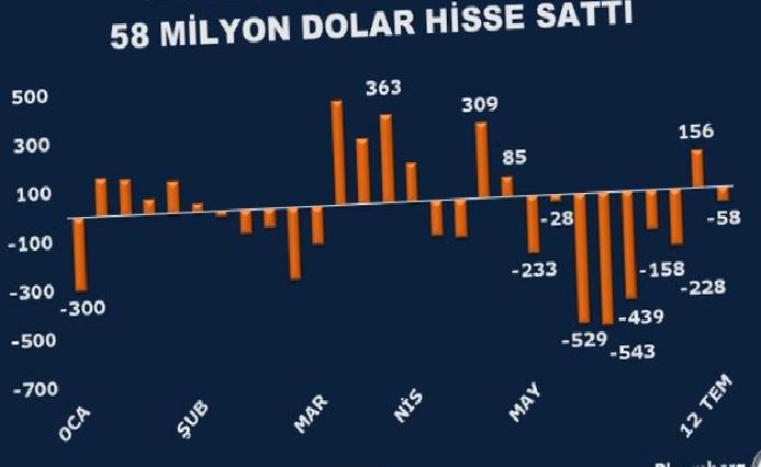 Türkiye Cumhuriyet Merkez Bankası (TCMB) tarafından açıklanan verilere göre 5 Temmuz haftasında yüklü portföy alımı yapan yaban payda satışa geçti. Yurt dışında yerleşik bireyler piyasa fiyatı ve kur hareketlerinden arındırılmış datalarla 12 Temmuz haftasında 57,7 milyon dolar net pay satışı yaptı. Türkiye Cumhuriyet Merkez Bankası(TCMB) tarafından açıklanan verilere göre, hafta DİBS (Kesin Alım) net alımları 895,4 milyon dolar oldu. Yurt dışında yerleşiklerin DİBS (Ters Repo) satımları net 9,4 milyon dolar, net DİBS (Teminat) alımları 97,8 milyon dolar oldu.